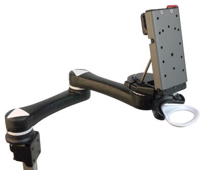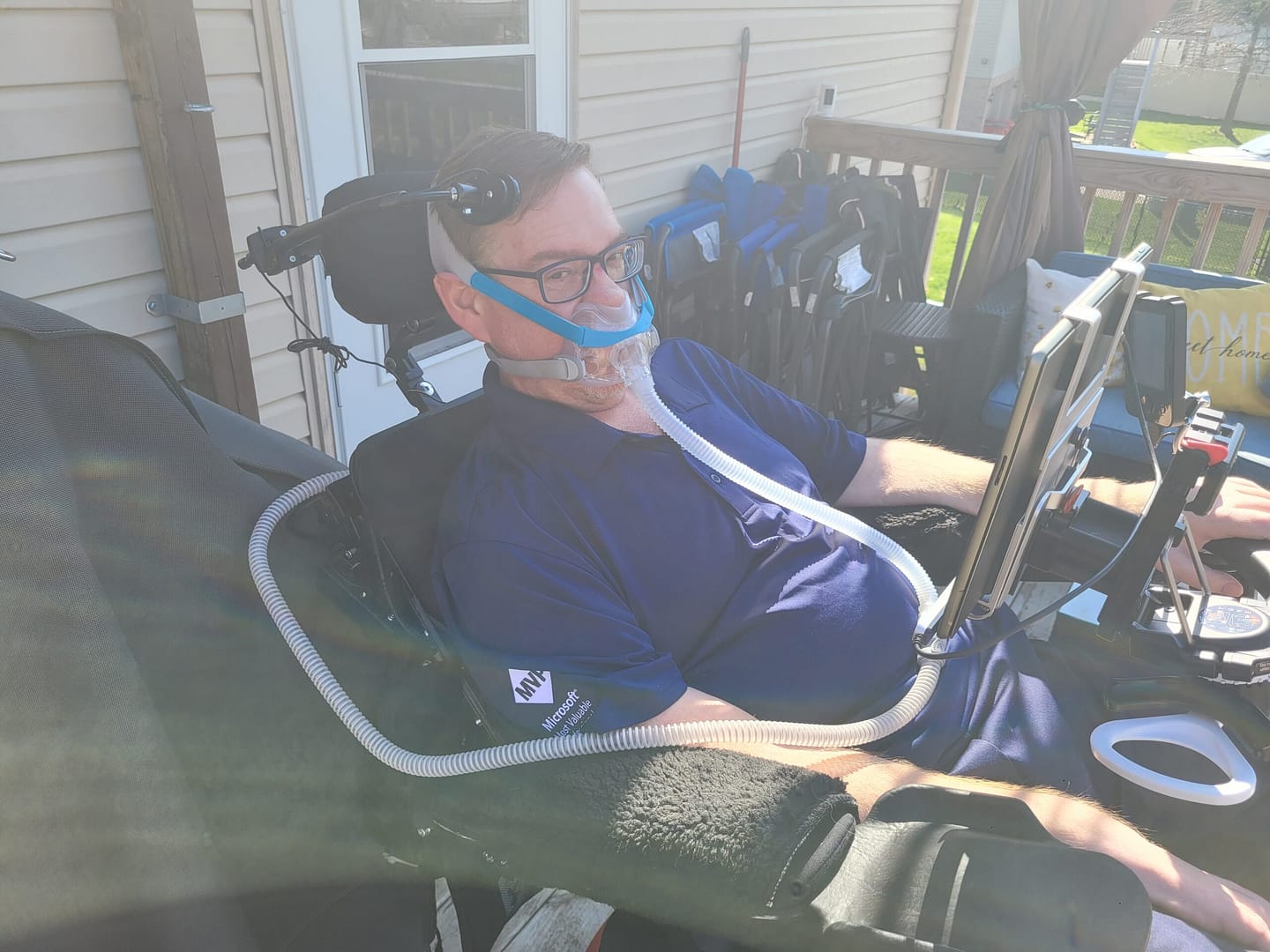 We were loaned a Mount’n Mover mount by our power chair tech. He was pretty sure I could use it. I used it extensively. Because it was adaptable, we used my PCEye bracket and I took my Surface with me everywhere. I used a combination of the foot control for my mouse with adaptable buttons through the Microsoft Adaptive Hub to control the computer.