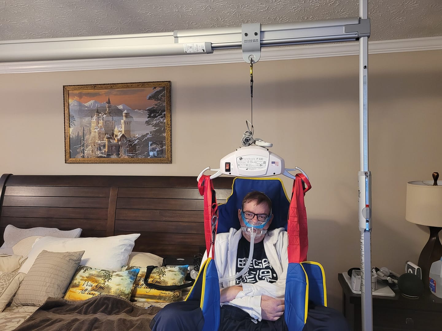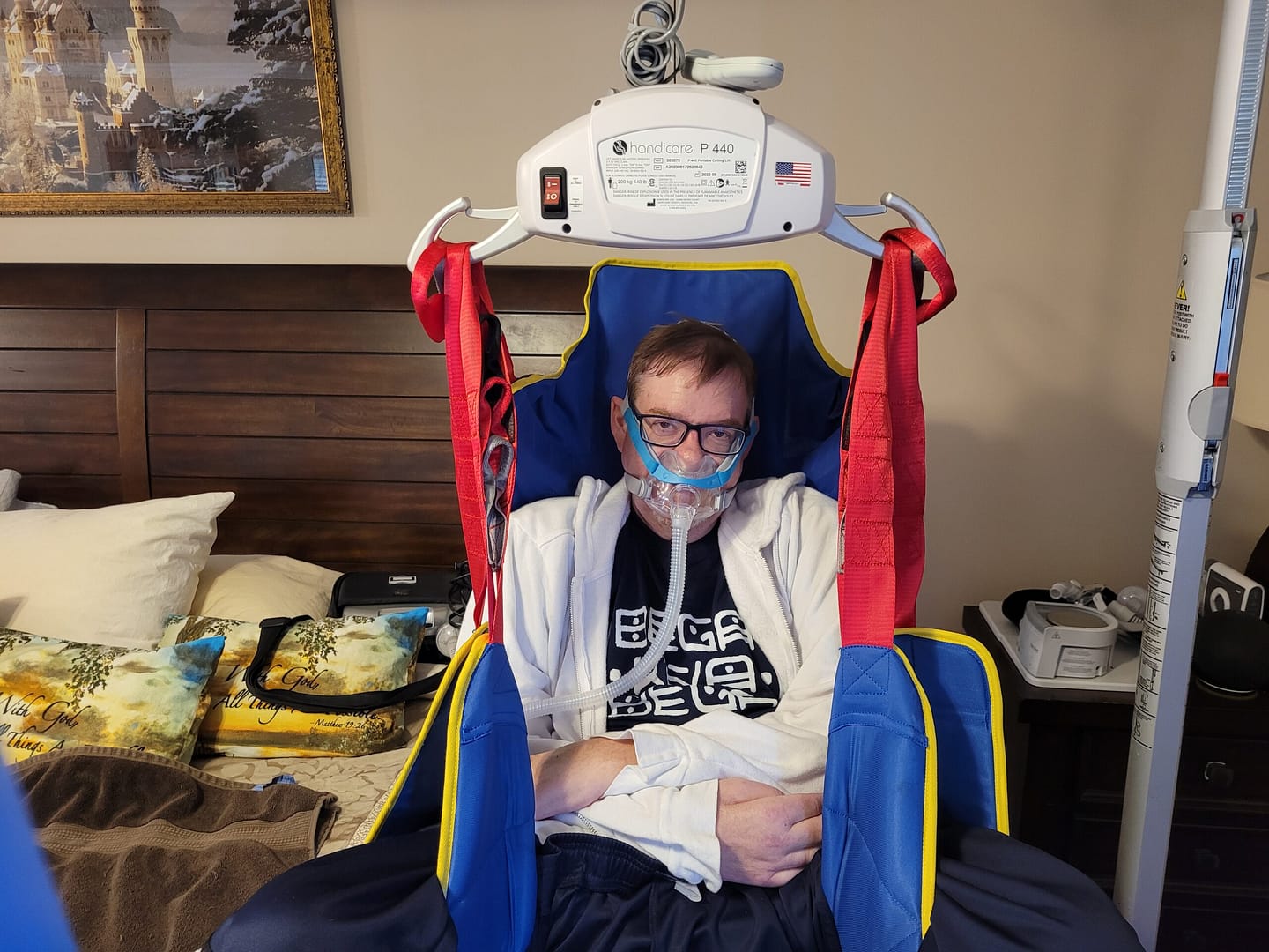 We use an overhead lift for all our regular home transfers. This includes transfers between the bed and the shower chair, between the bed and the power chair, and between both chairs.