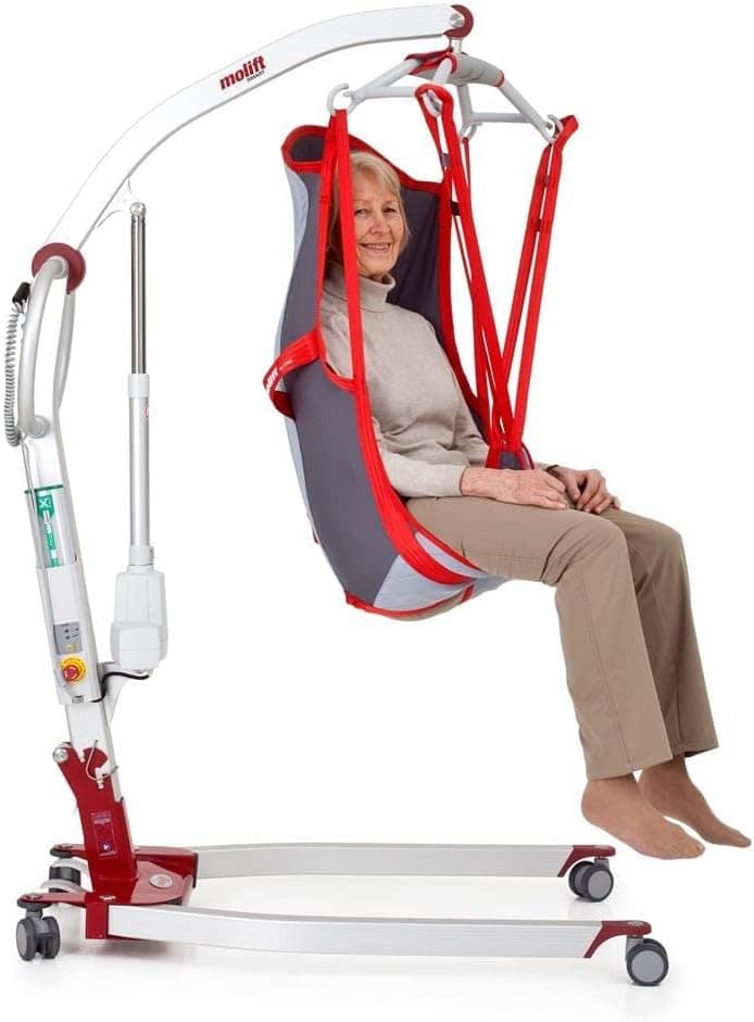 The MoLift is a battery powered, mobile lift. This lift folds up and is designed for easy transportation. We use it when we travel. Sheila can move this lift around fairly easy. This lift is also used as a backup at home if we have issues with the ceiling lift. Because it is battery powered, it is easy to operate.