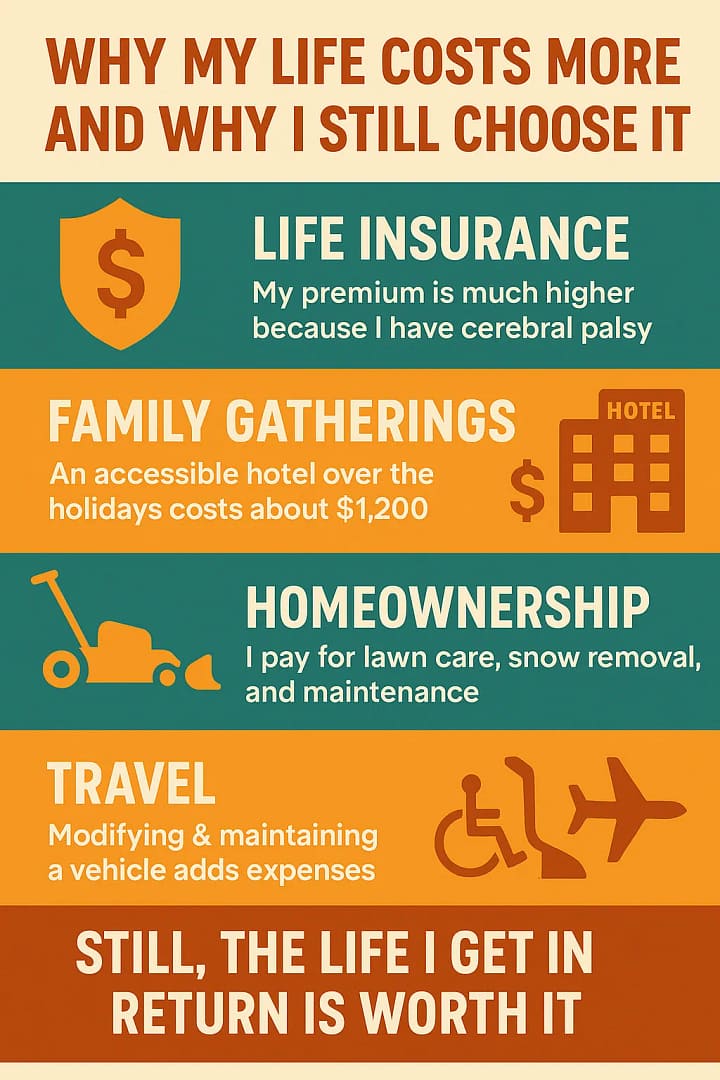 Then there is the cost of participating in family life. Take Christmas as a concrete example. Most family homes are not accessible. They have narrow doorways, tight bathrooms, stairs everywhere, and almost never have roll in showers. For me, a roll in shower is not a luxury. It is the only safe and practical way to travel. So while others can stay in a relative’s spare room or on a pullout couch, I need an accessible hotel. And that accessible room over the holidays can easily cost $1,200. That is the entry fee for me to join family celebrations. Everyone else arrives with cookies or gifts. I arrive with an extra four figure expense simply because the built world was not made for me.
